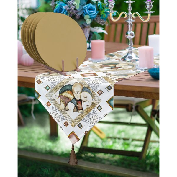 Realhomes Etnik Motifli Fil Tasarımlı Püsküllü Runner & 6’lı Hardal Düz Renk Supla – Servis Altlığı