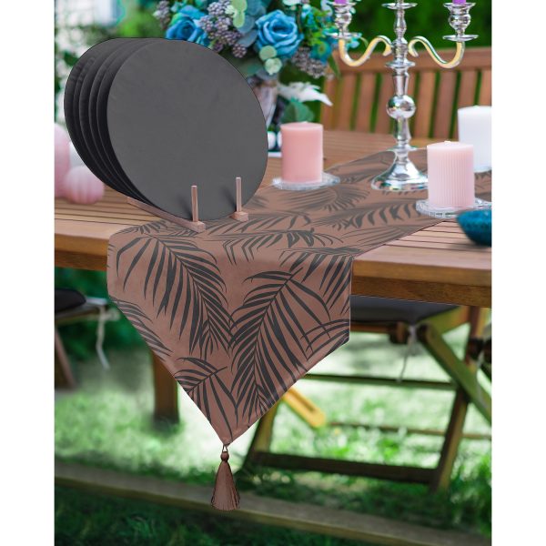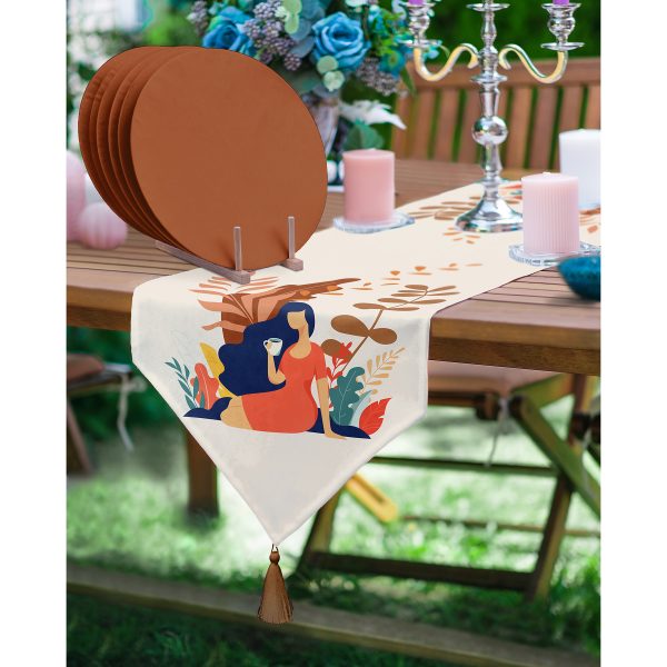 Realhomes Tropik Yapraklar Kadın Figürlü Püsküllü Runner & 6’lı Kahverengi Düz Renk Supla – Servis Altlığı