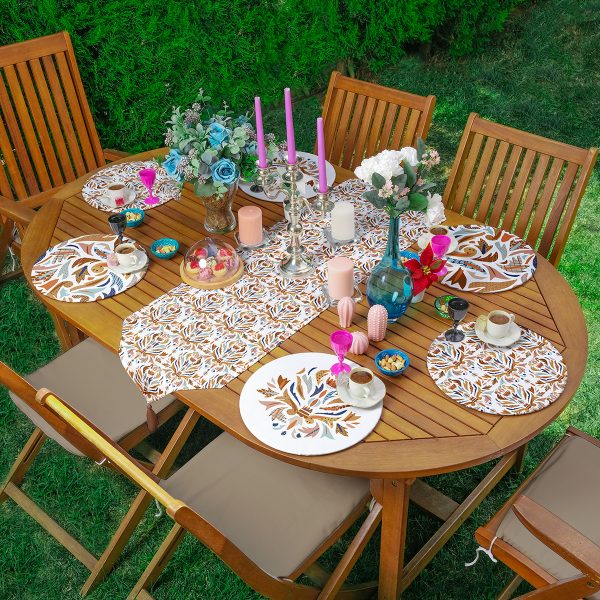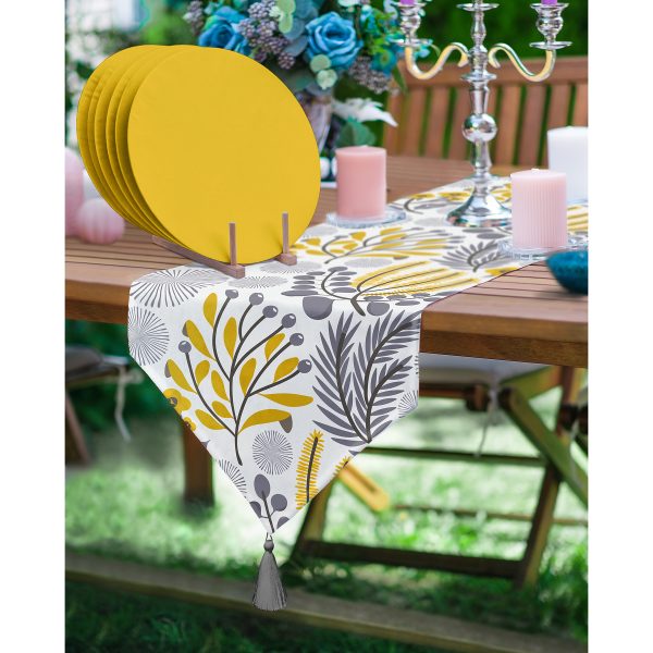 Realhomes Sanatsal Tropik Yaprak Motifli Püsküllü Runner & 6’lı Hardal Düz Renk Supla – Servis Altlığı