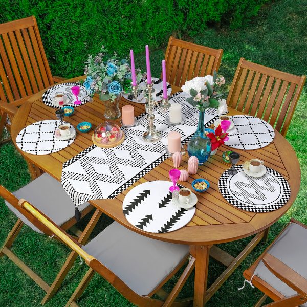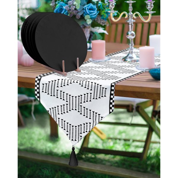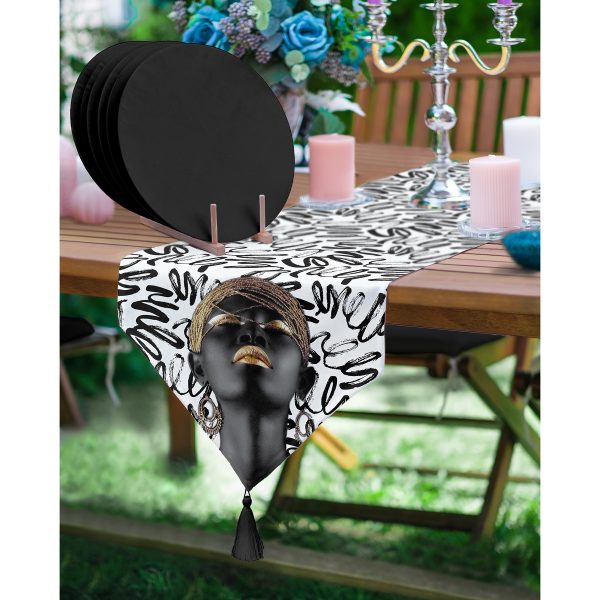 Realhomes Dalgalı Siyah Beyaz Zemin Afrika Kadın Motifli Püsküllü Runner & 6’lı Siyah Düz Renk Supla – Servis Altlığı