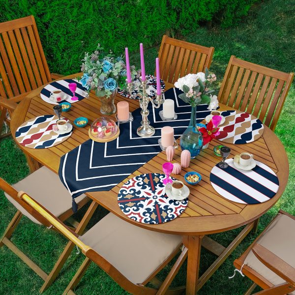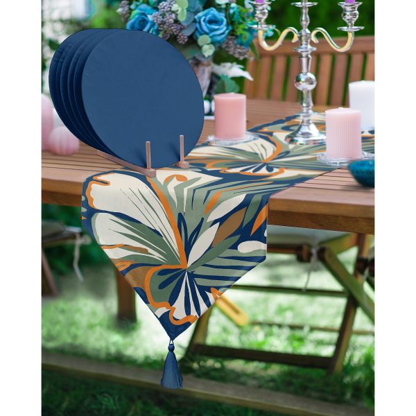Realhomes 6+1 Lacivert Renkli Sanatsal Motifli Dijital Baskılı Püsküllü Runner ve Yuvarlak Servis Altlığı & Supla Seti