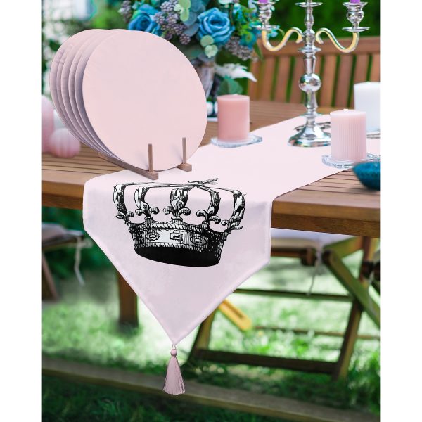 Realhomes Pembe Zemin Siyah Beyaz Taç Tasarımlı Püsküllü Runner & 6’lı Pembe Düz Renk Supla – Servis Altlığı