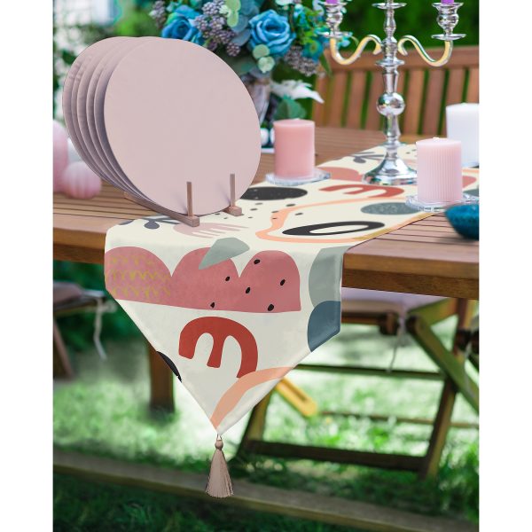Realhomes Onedraw Soyut Çizimli Püsküllü Runner & 6’lı Pembe Düz Renk Supla – Servis Altlığı
