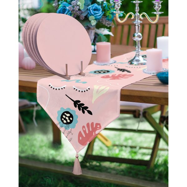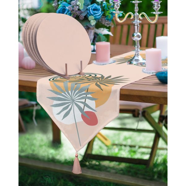 Realhomes Pudra Zemin Tropik Yaprak Tasarımlı Püsküllü Runner & 6’lı Pembe Düz Renk Supla – Servis Altlığı