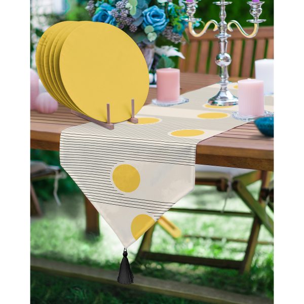 Realhomes Sarı Detaylı Çiçek Temalı Püsküllü Runner & 6’lı Hardal Düz Renk Supla – Servis Altlığı