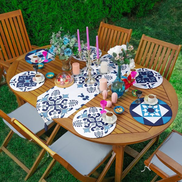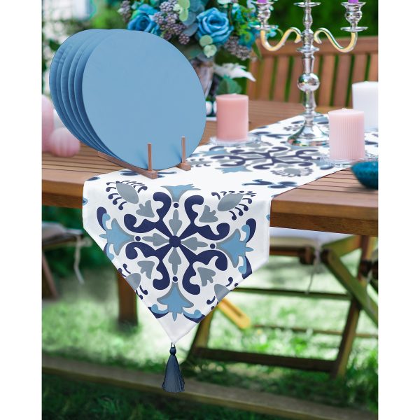 Realhomes Mavi Çini Motifli Püsküllü Runner & 6’lı Mavi Düz Renk Supla – Servis Altlığı