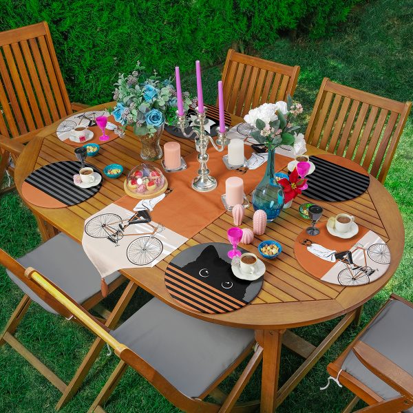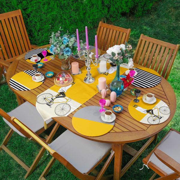 Realhomes 6+1 Hardal Bisikletli Kedili Motifli Dekoratif Püsküllü Runner ve Yuvarlak Servis Altlığı & Supla Seti