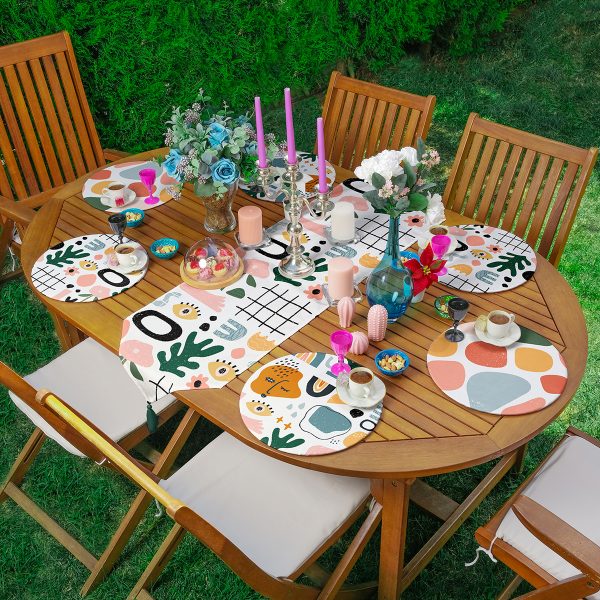 Realhomes 6+1 Renkli Etnik Motifli Dijital Baskılı Özel Tasarımlı Püsküllü Runner ve Yuvarlak Servis Altlığı & Supla Seti
