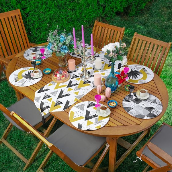 Realhomes 6+1 Geometrik Üçgen Tasarımlı Tropik Yaprak Motifli Dijital Baskılı Püsküllü Runner ve Yuvarlak Servis Altlığı & Supla Seti