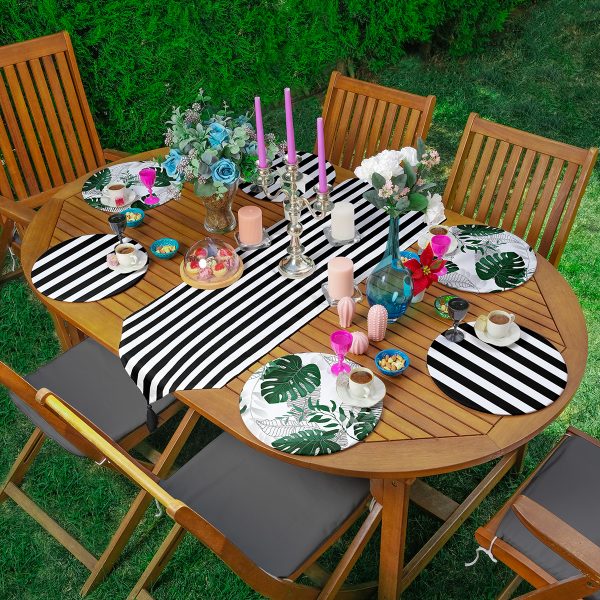 Realhomes 6+1 Siyah Beyaz Çizgili Tropik Yapraklar Özel Tasarım Modern Püsküllü Runner ve Yuvarlak Servis Altlığı & Supla Seti