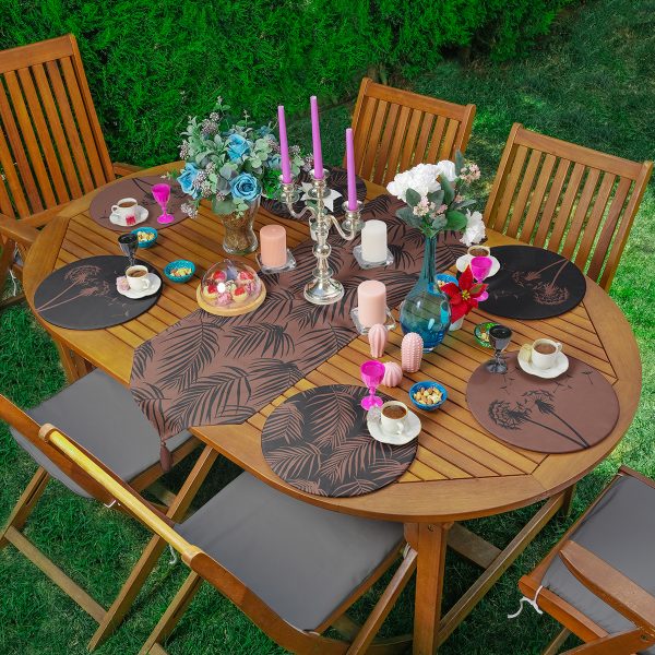 Realhomes 6+1 Koyu Temalı Tropik Yaprak Karahindiba Tasarımlı Püsküllü Runner ve Yuvarlak Servis Altlığı & Supla Seti