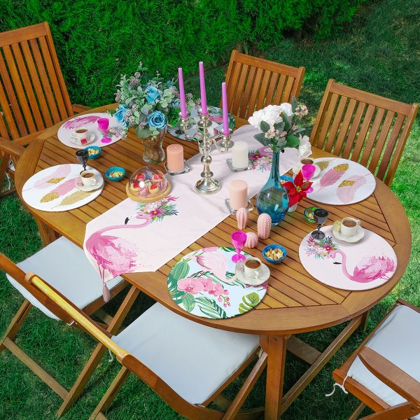 Realhomes 6+1 Pembe Temalı Flamingo Tasarımlı Dijital Baskılı Modern Püsküllü Runner ve Yuvarlak Servis Altlığı & Supla Seti
