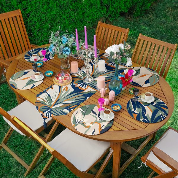 Realhomes 6+1 Suluboya Temalı Tropik Yaprak Tasarımlı Dijital Baskılı Püsküllü Runner ve Yuvarlak Servis Altlığı & Supla Seti