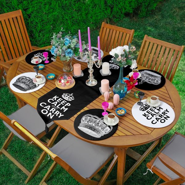 Realhomes 6+1 Siyah Beyaz Temalı Kral Tacı Tasarımlı Dijital Baskılı Püsküllü Runner ve Yuvarlak Servis Altlığı & Supla Seti