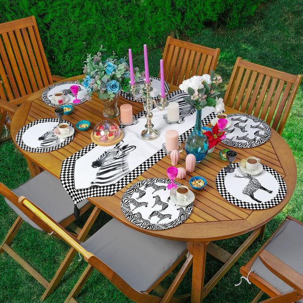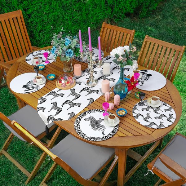 Realhomes 6+1 Siyah Beyaz Zebra Temalı Özel Tasarım Dijital Baskılı Modern Püsküllü Runner ve Yuvarlak Servis Altlığı & Supla Seti