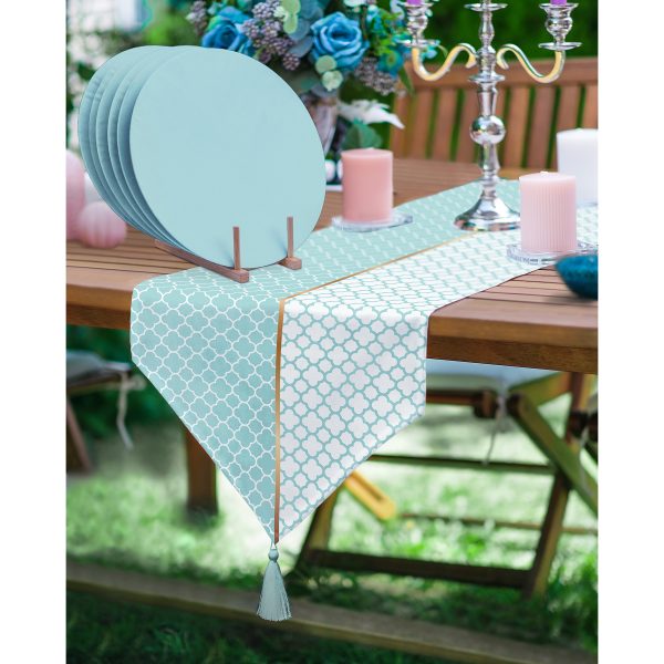 Realhomes Mint Yeşili & Beyaz Ogea Desenli Püsküllü Runner & 6’lı Mint Yeşili Düz Renk Supla – Servis Altlığı