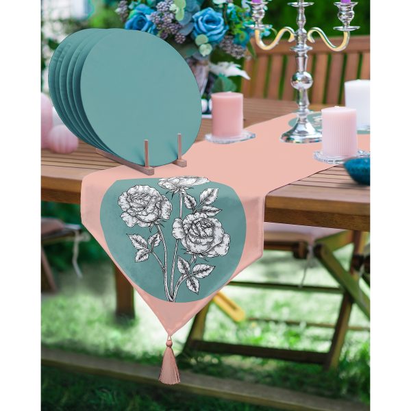 Realhomes Pudra Yeşil Zeminli Beyaz Gül Tasarımlı Püsküllü Runner & 6’lı Yeşil Düz Renk Supla – Servis Altlığı