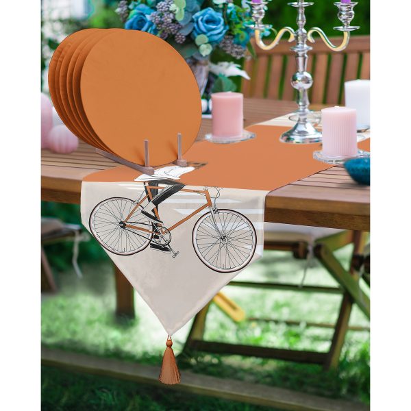 Realhomes Koyu Turuncu Krem Zemin Bisikletli Adam Motifli Püsküllü Runner & 6’lı Kiremit Düz Renk Supla – Servis Altlığı