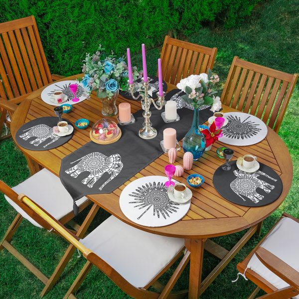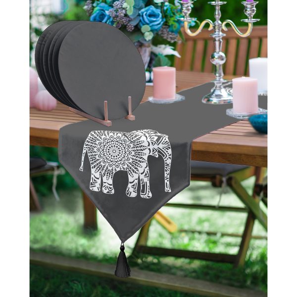 Realhomes Koyu Füme Zemin Etnik Fil Motifli Püsküllü Runner & 6’lı Siyah Düz Renk Supla – Servis Altlığı