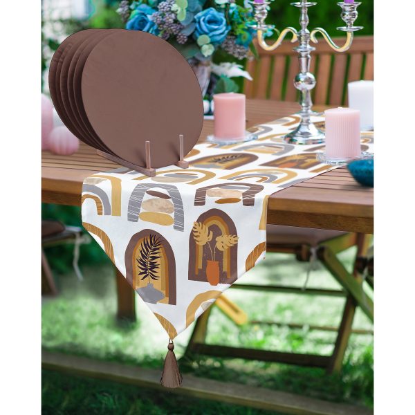 Realhomes Etnik Soyut Tasarımlı Püsküllü Runner & 6’lı Kahverengi Düz Renk Supla – Servis Altlığı