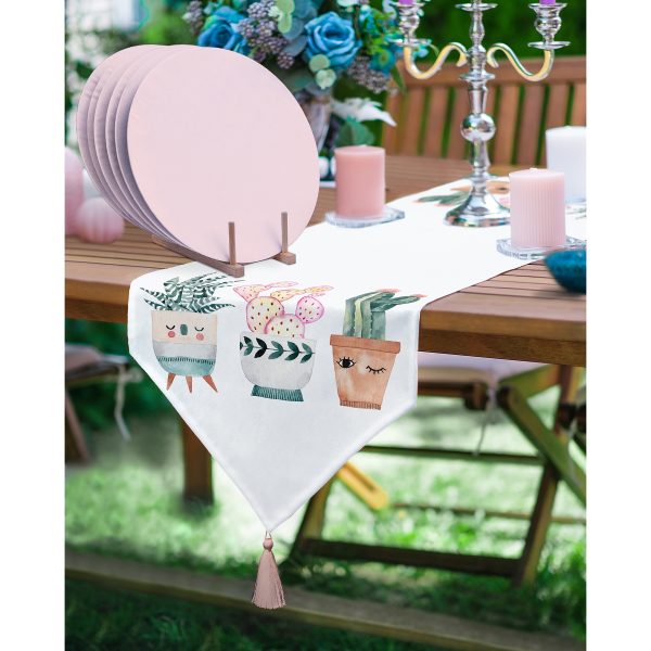Realhomes Kaktüs Motifli Dekotarif Püsküllü Runner & 6’lı Pembe Düz Renk Supla – Servis Altlığı