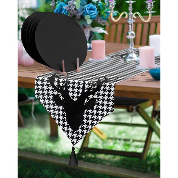 Realhomes Kazayağı Zemin Geyik Tasarımlı Püsküllü Runner & 6’lı Siyah Düz Renk Supla – Servis Altlığı