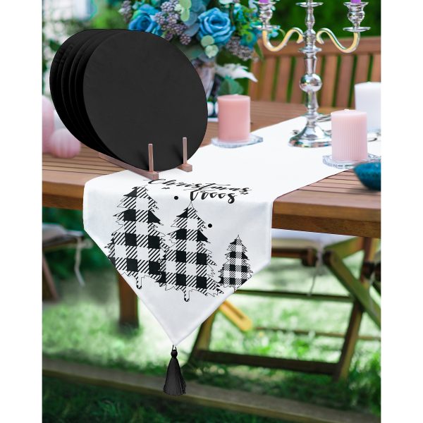 Realhomes Christmas Temalı Ekose Çam Ağacı Motifli Püsküllü Runner & 6’lı Siyah Düz Renk Supla – Servis Altlığı