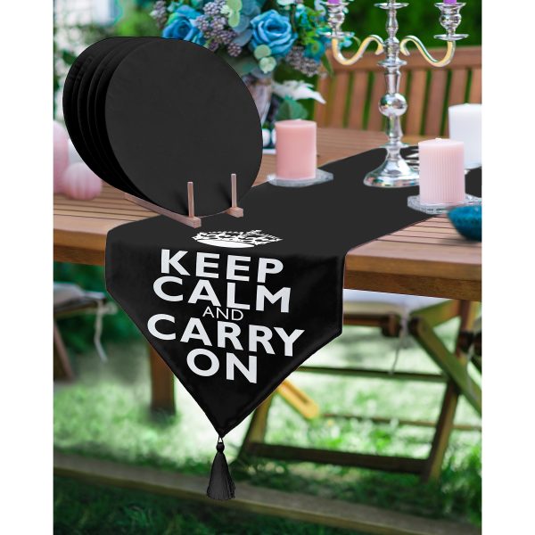 Realhomes Siyah Beyaz Keep Calm And Carry On Baskılı Püsküllü Runner & 6’lı Siyah Düz Renk Supla – Servis Altlığı