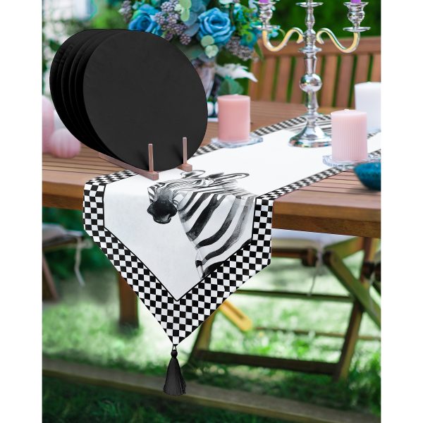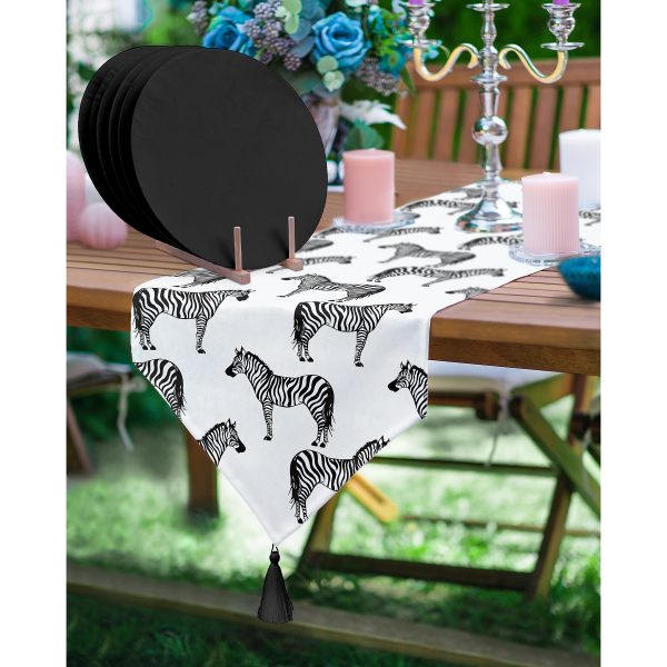 Realhomes Zebra Tasarımlı Püsküllü Runner & 6’lı Siyah Düz Renk Supla – Servis Altlığı