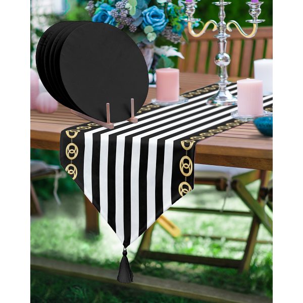 Realhomes Damalı Çerçeve Motifli Zebra Desenli Püsküllü Runner & 6’lı Siyah Düz Renk Supla – Servis Altlığı
