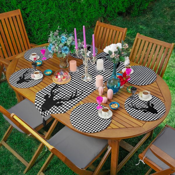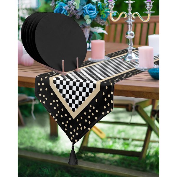 Realhomes Puantiye Motifli Dama Tasarımlı Püsküllü Runner & 6’lı Siyah Düz Renk Supla – Servis Altlığı