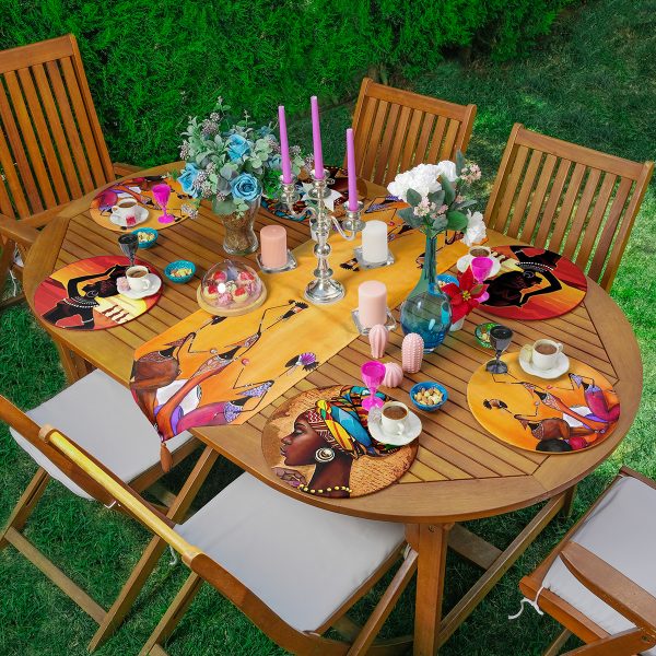 Realhomes 6+1 Etnik Afrika Kadınlar Özel Tasarımlı Dijital Baskılı Püsküllü Runner ve Yuvarlak Servis Altlığı & Supla Seti