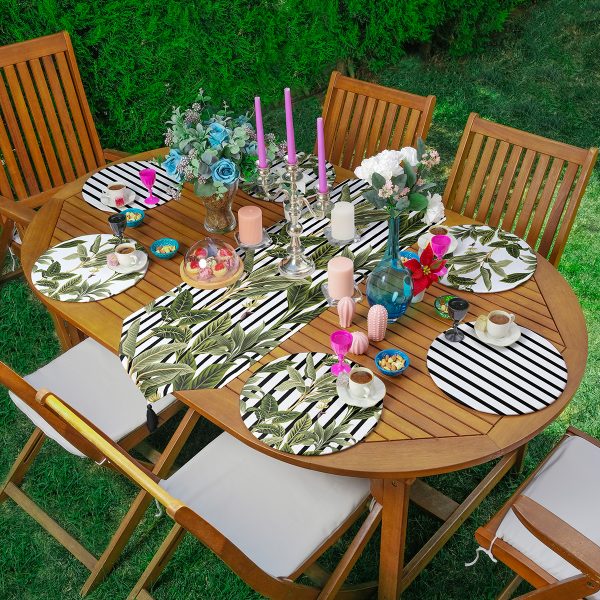 Realhomes 6+1 Düz Çizgili Tropik Yapraklar Özel Tasarımlı Püsküllü Runner ve Yuvarlak Servis Altlığı & Supla Seti