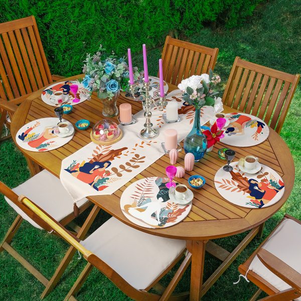 Realhomes 6+1 Tropik Yapraklar Kadın Tasarımlı Dijital Baskılı Modern Püsküllü Runner ve Yuvarlak Servis Altlığı & Supla Seti