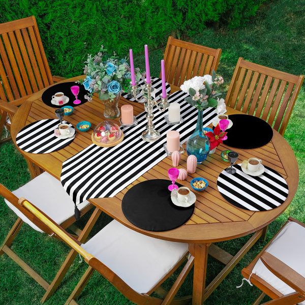 Realhomes 6+1 Siyah Beyaz Çizgili Düz Siyah Özel Tasarımlı Modern Püsküllü Runner ve Yuvarlak Servis Altlığı & Supla Seti