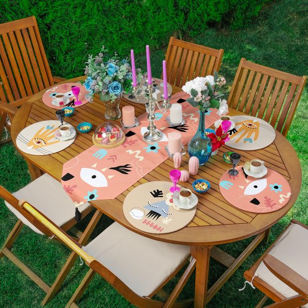 Realhomes Onedraw Soyut Çizimli Püsküllü Runner & 6’lı Pembe Düz Renk Supla – Servis Altlığı