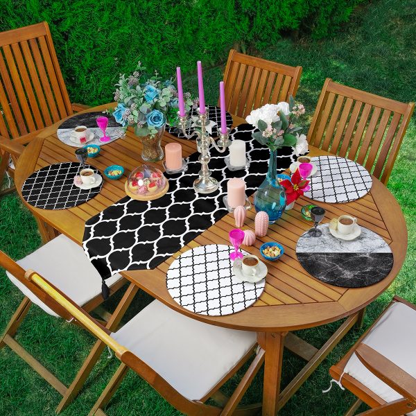 Realhomes 6+1 Siyah Beyaz Ogea Motifli Mermer Tasarımlı Püsküllü Runner ve Yuvarlak Servis Altlığı & Supla Seti