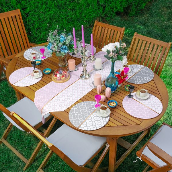 Realhomes 6+1 Pembe Gri Ogea Motifli Dijital Baskılı Dekoratif Püsküllü Runner ve Yuvarlak Servis Altlığı & Supla Seti