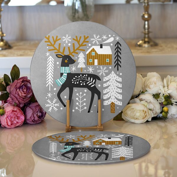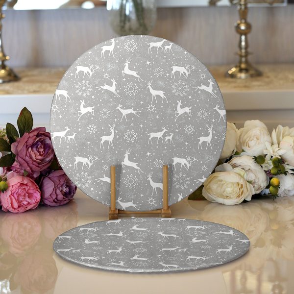 Realhomes Gri Zeminli Geyikler ve Kar Taneleri Tasarımlı Dijital Baskılı Modern 2’li Yuvarlak Servis Altlığı – Supla