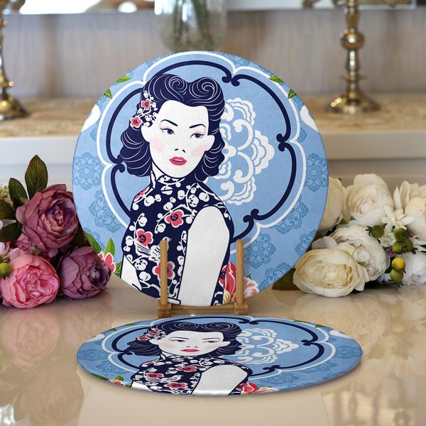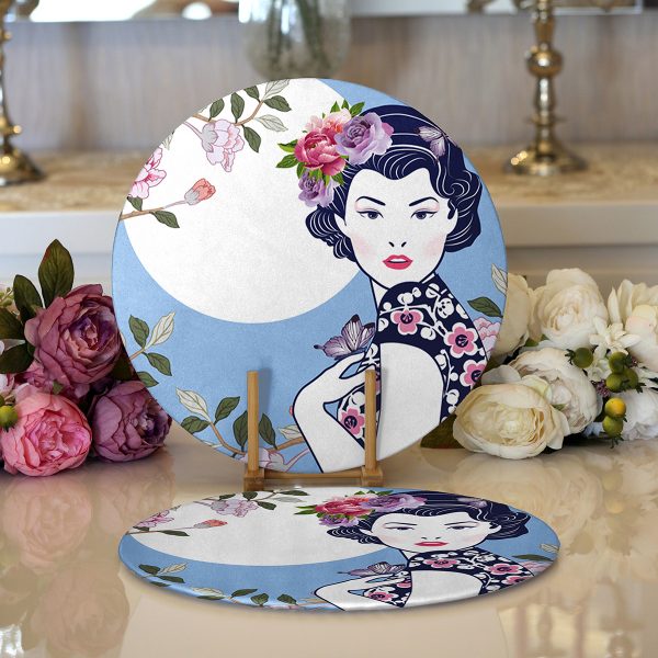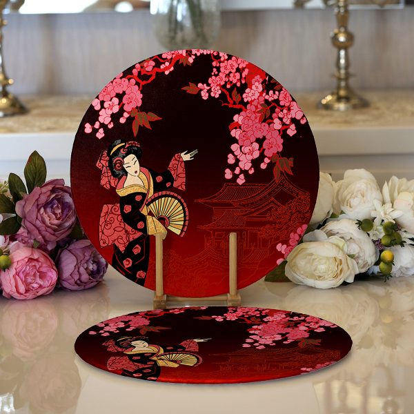Realhomes Çiçek Desenli Yelpazeli Japon Kız Motifli Modern 2’li Yuvarlak Servis Altlığı – Supla
