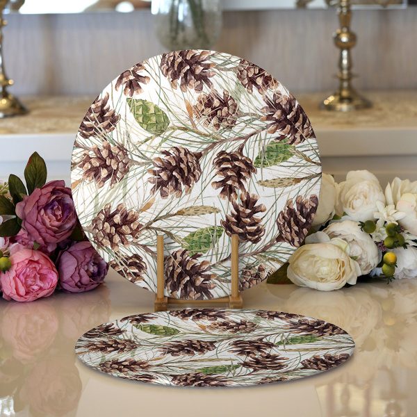 Realhomes Beyaz Zemin Üzerinde Kozalak Desenli Dijital Baskılı Modern 2’li Yuvarlak Servis Altlığı – Supla