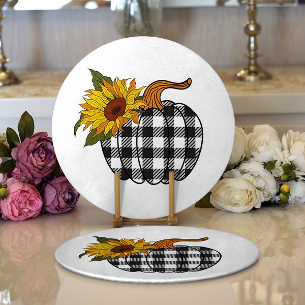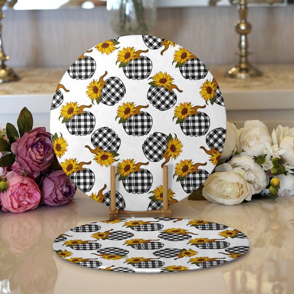 Realhomes Beyaz Zemin Üzerinde Ayçiçek Desenli Ekoseli Balkabağı 2’li Yuvarlak Servis Altlığı – Supla