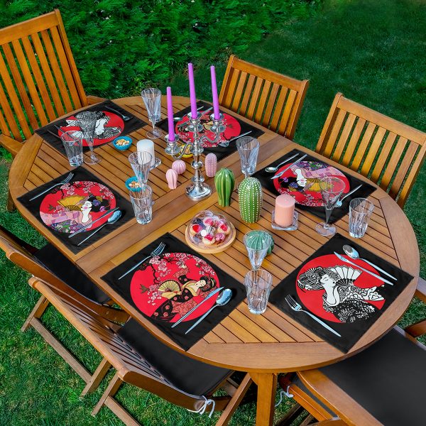 6’lı Kırmızı Zemin Yelpazeli Japon Kadın Tasarımlı Amerikan Servis Seti