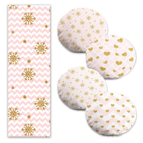 Pembe Zigzag Altın Varaklı Kar Taneleri 4 Yuvarlak Kırlent Kılıfı ve 1 Runner Seti
