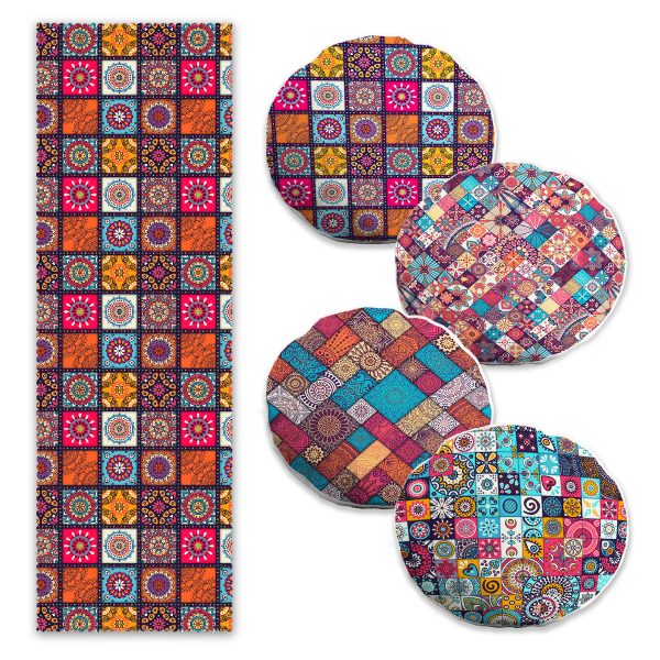 Bohem Çizimler Tasarımlı 4 Yuvarlak Kırlent Kılıfı ve 1 Runner Seti