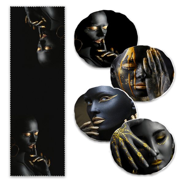 Siyah Zeminde Siyahi Kadın Tasarımları 4 Yuvarlak Kırlent Kılıfı ve 1 Runner Seti