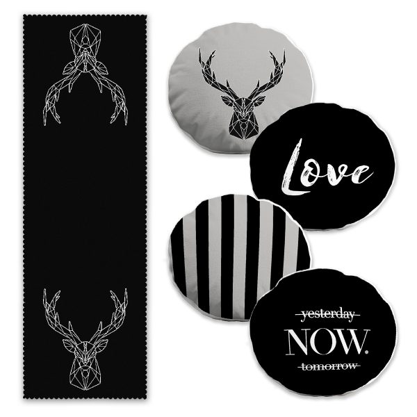 Siyah Geyik Tasarımlı Modern 4 Yuvarlak Kırlent Kılıfı ve 1 Runner Seti