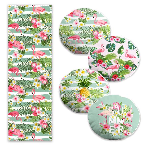 Yeşillik İçinde Flamingo Tasarımlı 4 Yuvarlak Kırlent Kılıfı ve 1 Runner Seti