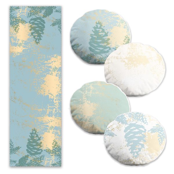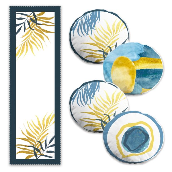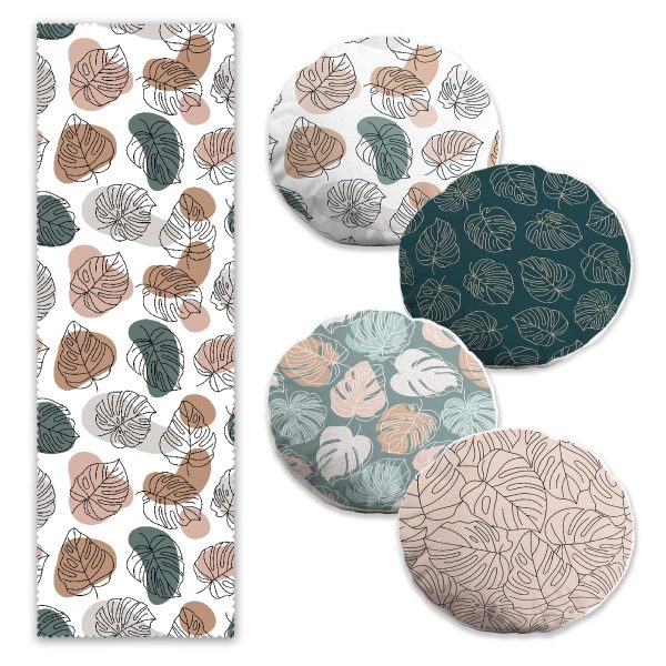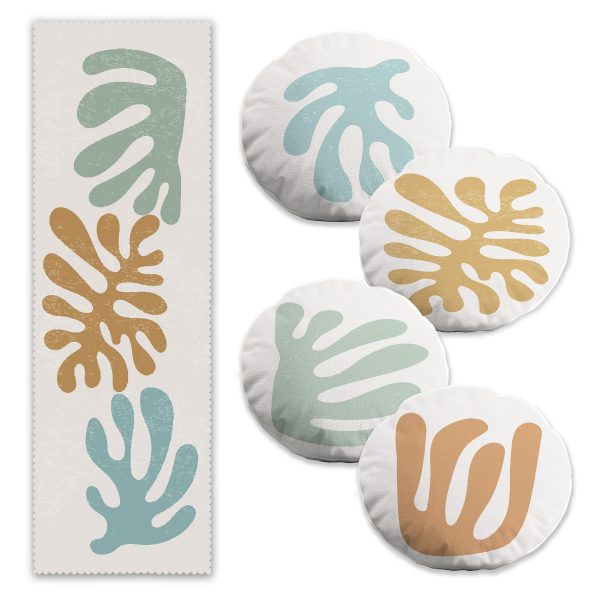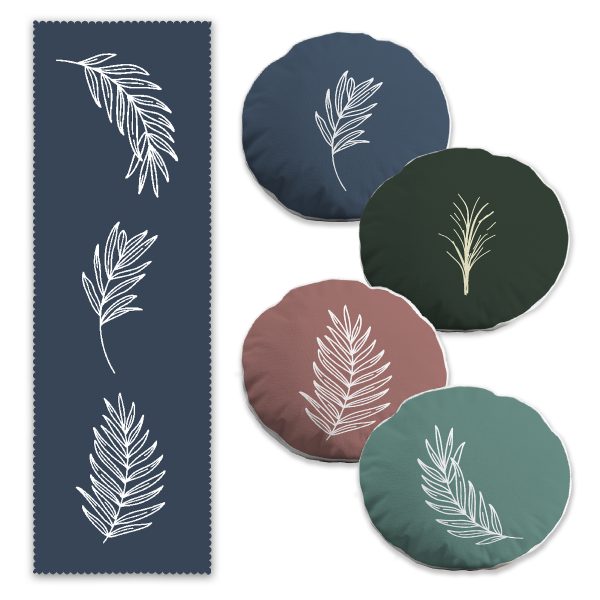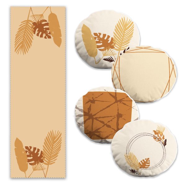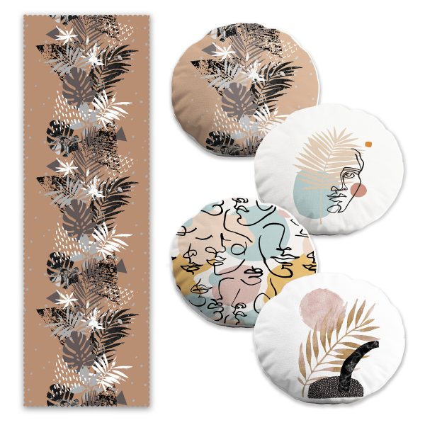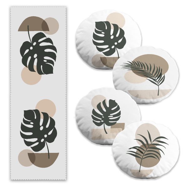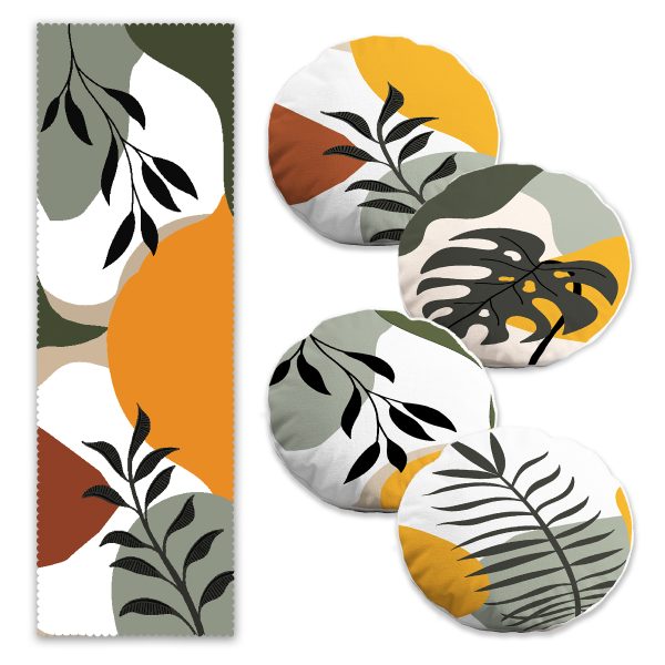 Modern Yaprak Tasarımlı 4 Yuvarlak Kırlent Kılıfı ve 1 Runner Seti