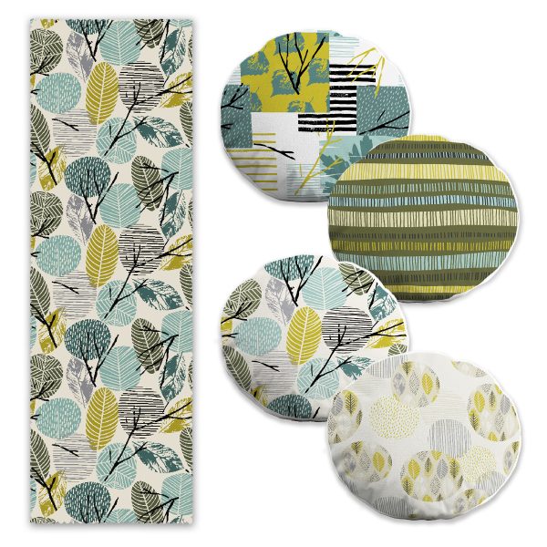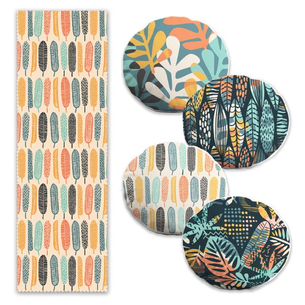 Renkli Zemin Yaprak Motifli 4 Yuvarlak Kırlent Kılıfı ve 1 Runner Seti
